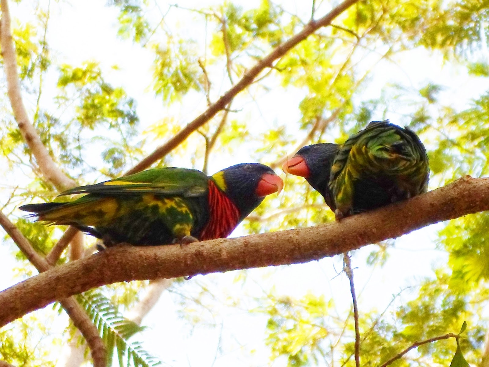 | Lories perched on a branch along the Bird Thrill trail |
